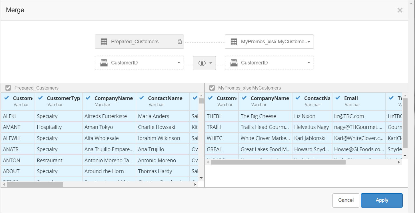 Modeler compares the two tables and merges them based on the join, and hides the deselected columns. It returns the results, in this case the 5 local customers with all the data from corporate, augmented by the email and Twitter columns provided by the manager. Modeler also shows the merge step in the pipeline below the data.