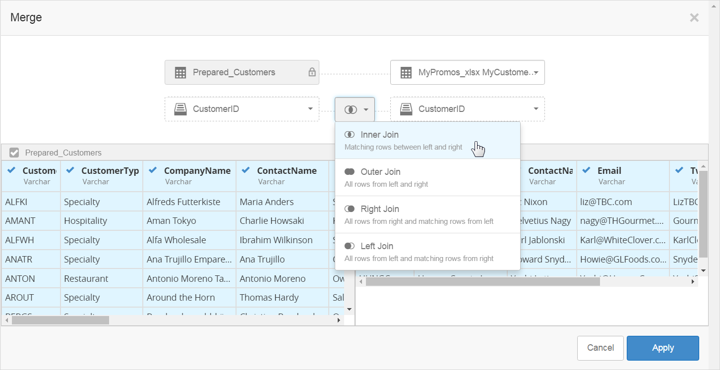Note: Part of deciding how to use the join depends on what rows the final prepared source should contain. This is controlled by the type of join. For example, the default inner join will match the rows between the left and right tables, and return only the ones that contain the same CustomerID in both columns. An outer join would return all the rows from each table, a right join would result in all the rows from the right and any rows that match the same CustomerID from the left, and a left joint would result in all the rows from the left table and any rows that match the same CustomerID from the right table.In this scenario, the manager does not care about all the rows that are not from the local customers, and does care about getting all the columns from the corporate data. So an inner join is the best choice. - Click the Join, then select Inner Join.