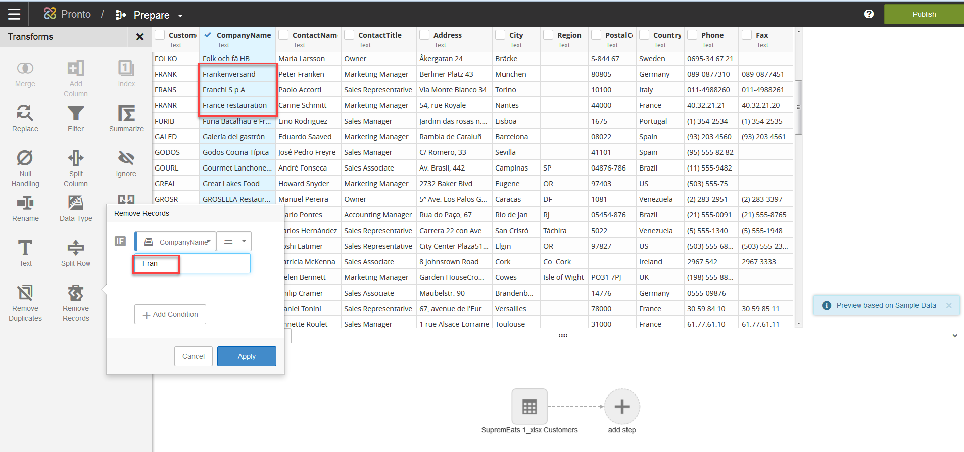 Note: Be careful when entering your criteria as the Remove Records transformation will remove all records that meet the criteria. For instance, when entering "Fran" in the below condition, the Remove Records transformation will remove all of the records that start with "Fran".