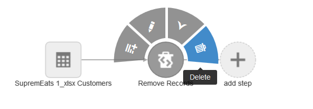 Deletes records based on the contents of one or more columns. Select a column and enter the condition(s) to remove records from your prepared source.
