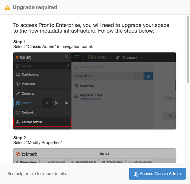 Follow the steps outlined in the modal to upgrade your space to the new metadata infrastructure. The process takes under a minute.