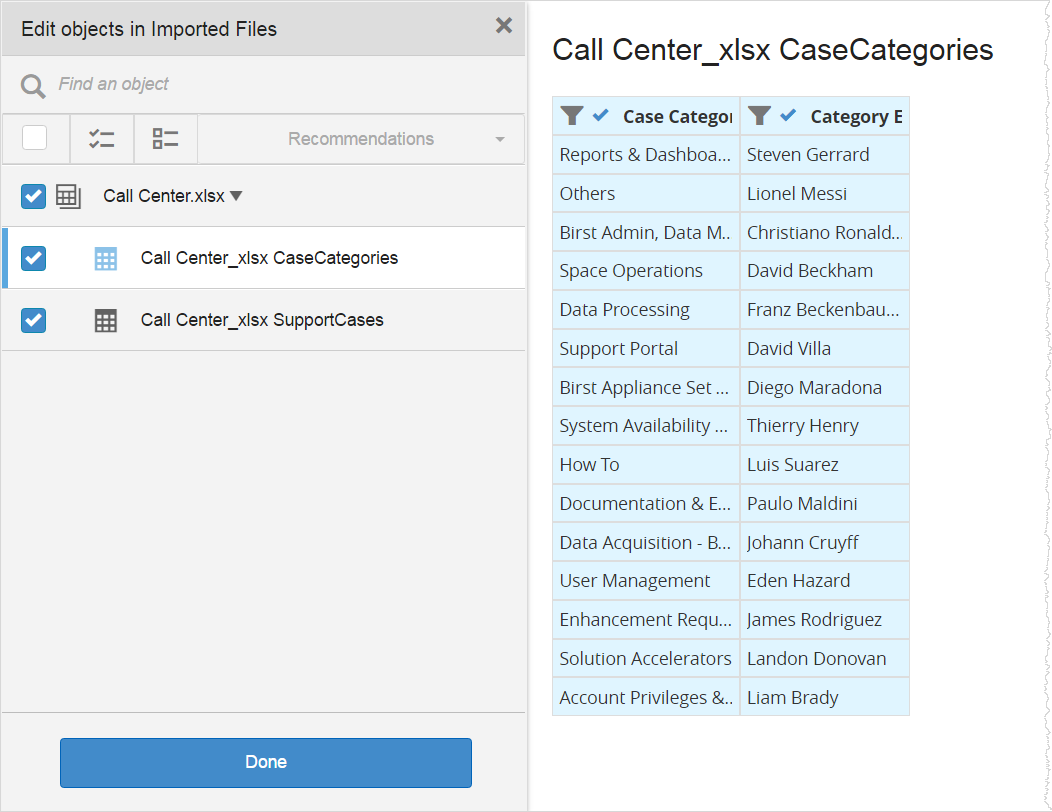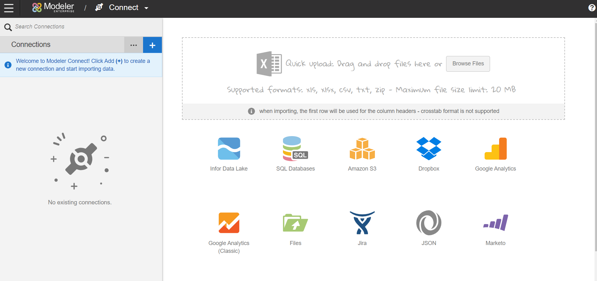 You can upload data source files such as an Excel worksheet. Modeler supports common file types such as text, Excel, and CSV. Worksheets in an Excel Workbook will be treated as separate data sources.