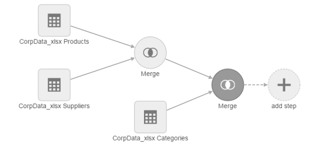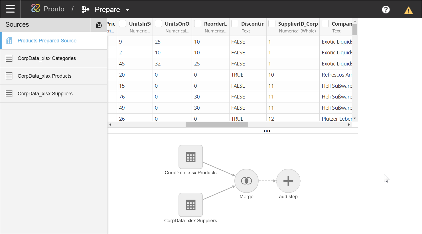 Now the merge is defined. Click . Modeler compares the two tables and merges them based on the join. It returns the results, in this case all the Products, augmented by all of the Suppliers columns for each product. Modeler also shows the merge step in the pipeline below the data.