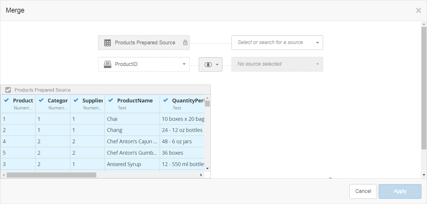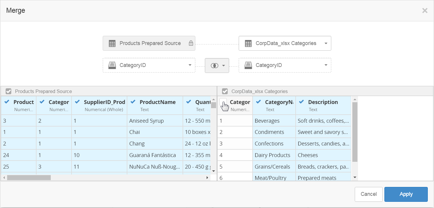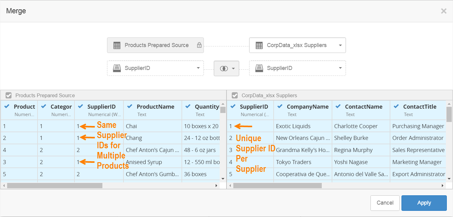 To make sure that the new rows are aligned correctly, you specify a join. Joins have different types. Part of deciding how to use the join depends on what rows the final prepared source should contain. For this example, the default inner join will match the rows between the left and right tables, and return only the ones that contain the same SupplierID in both columns.