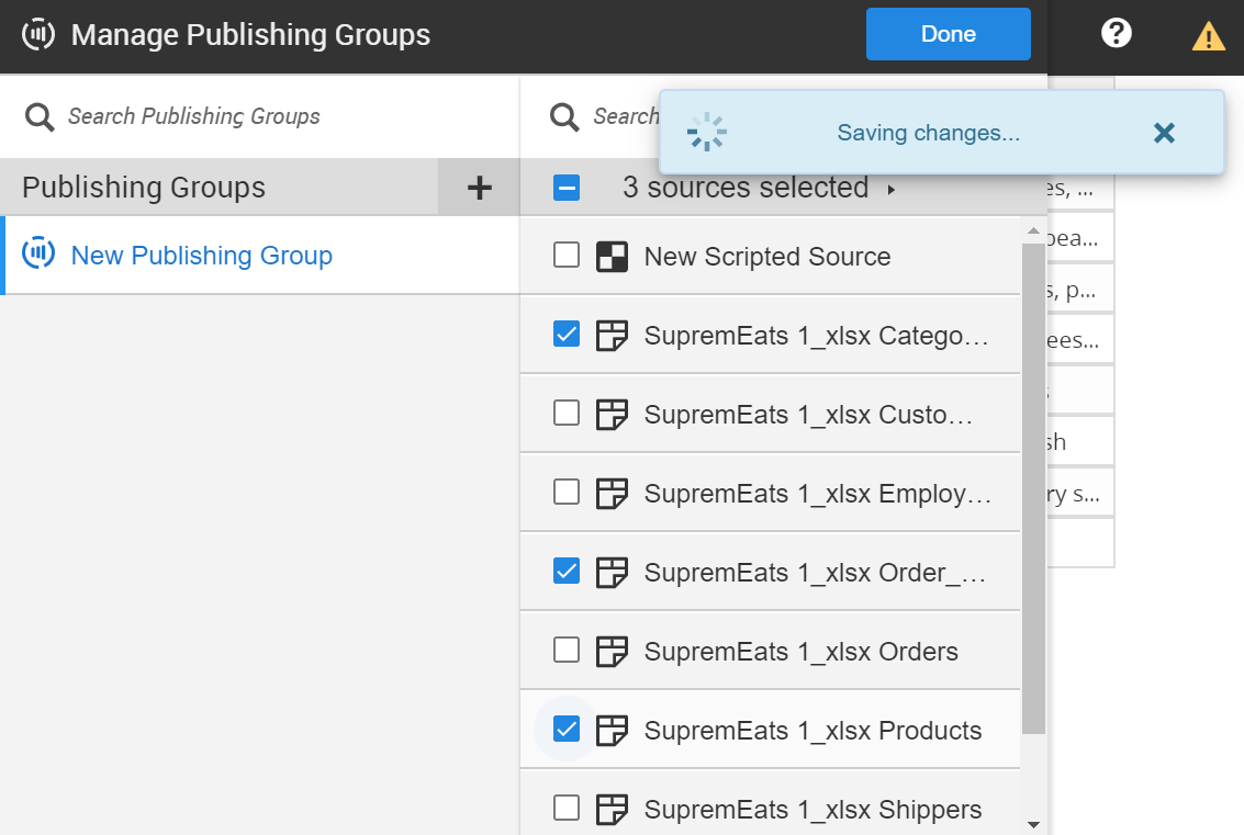 Note: Sources can be added to a publishing group regardless of their status. Ignored sources are ignored when the publishing source is executed.When a source is selected or deselected, the publishing group is automatically saved.