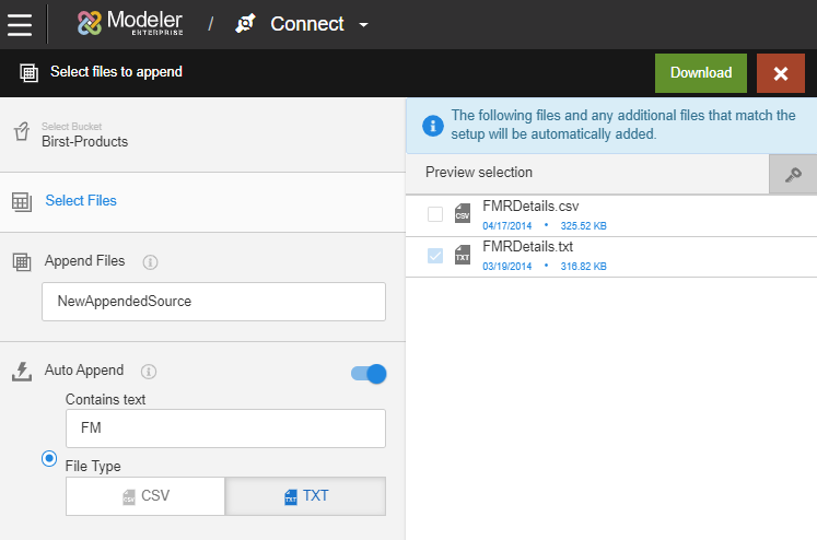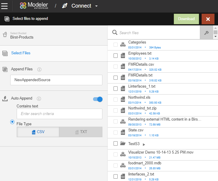The Auto Append feature allows you to automatically append files based on search criteria. When the data is extracted in to Birst, the files are downloaded and any new files or folders matching the criteria are appended.