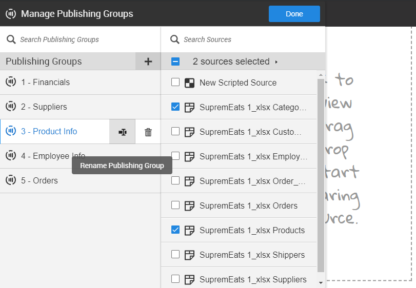 - Select and deselect the sources in the publishing group. When a source is selected or deselected, the publishing group is automatically saved.