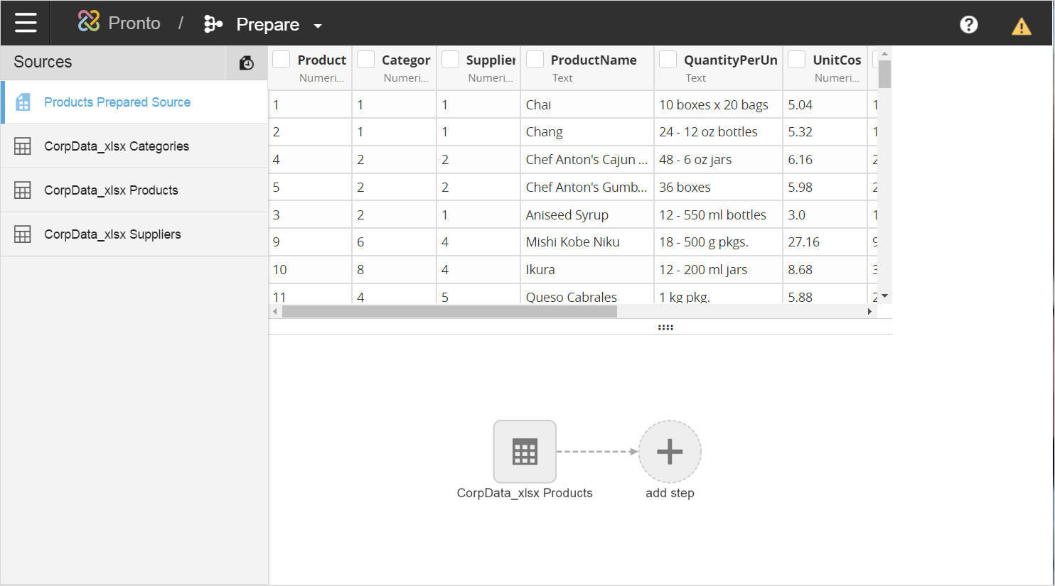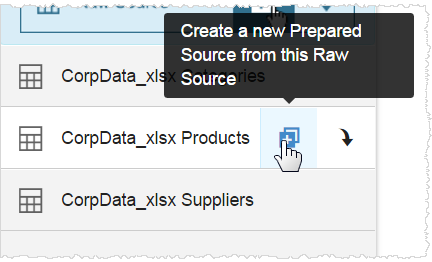 For this scenario, start with the Products data. In Modeler Prepare, locate the CorpData_xlsx Products table. This was the Products sheet in the original file. Click .