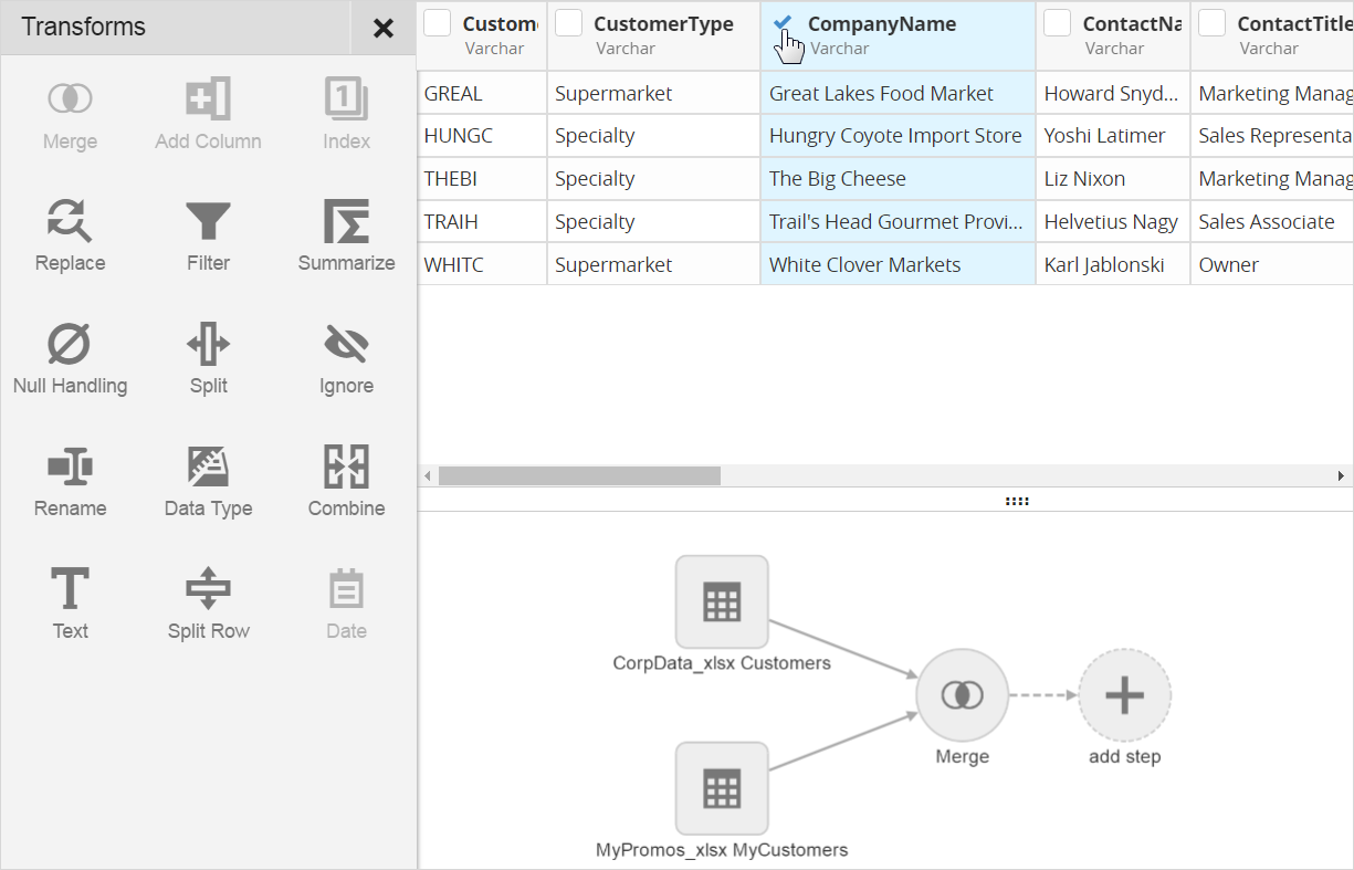 Scroll to the CompanyName column and select it. The Transforms menu highlights all the customizations that could be used for that column.