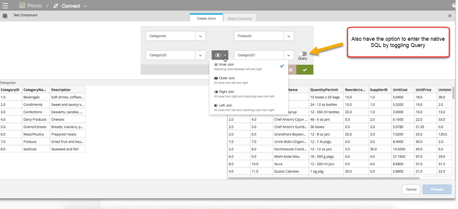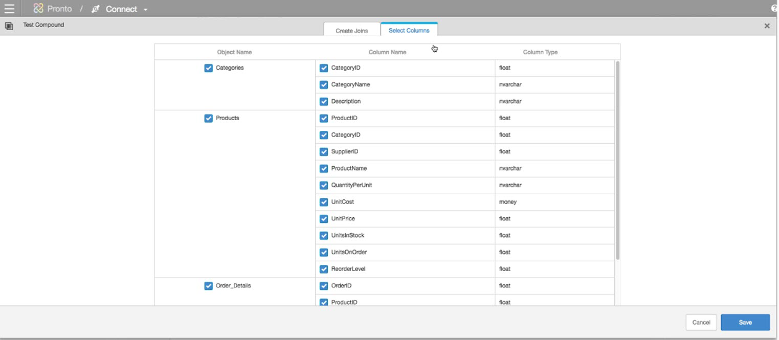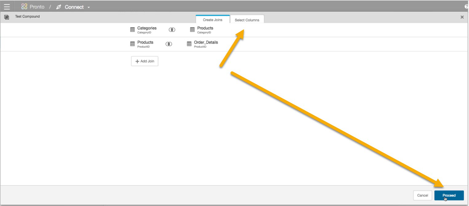 After creating the joins, you can click on Proceed or "Select Columns" to edit the columns you would like to include in your compound table, or click "Save" to have Birst automatically assemble the Compound Table with all columns from all joined tables included by default.