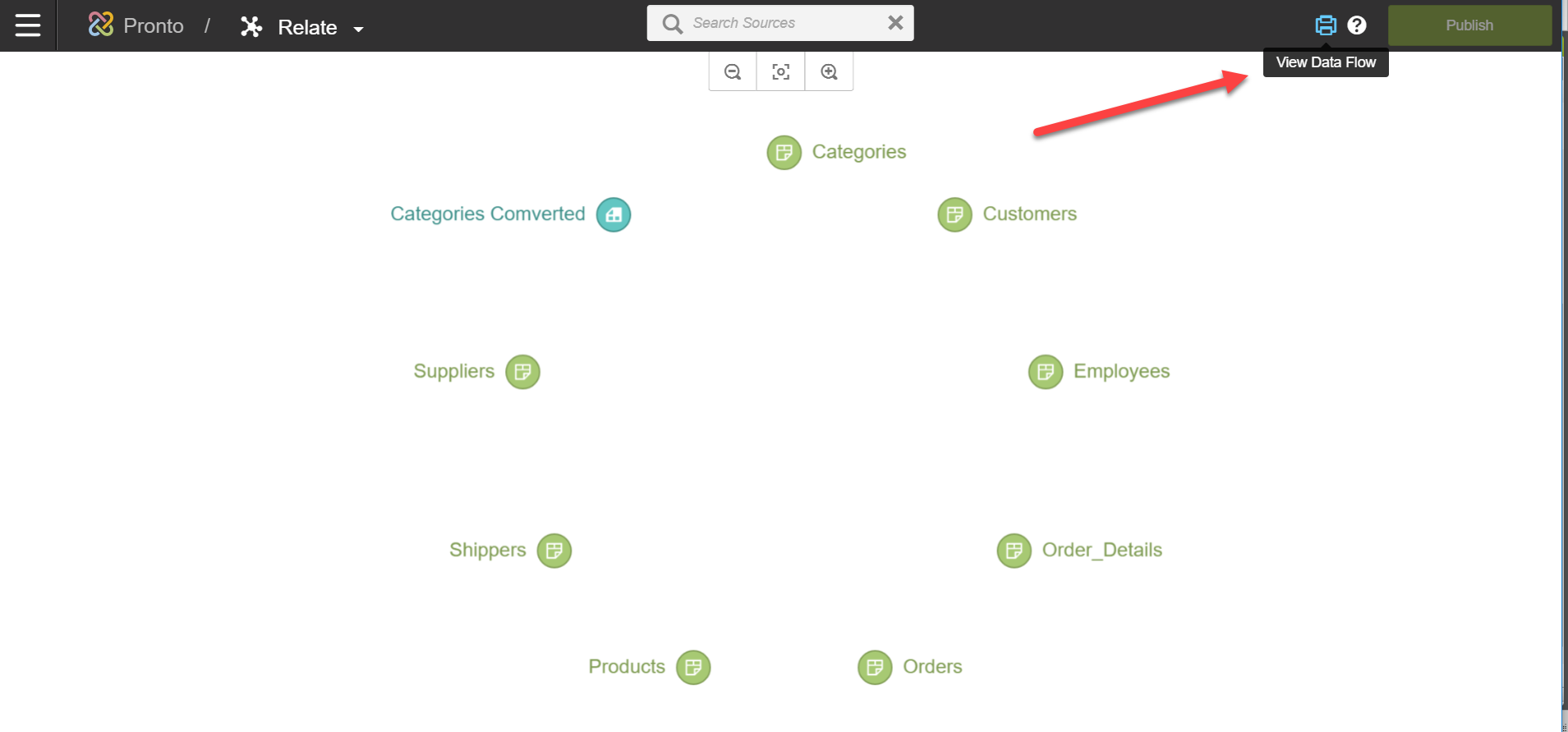 To see the Data Flow relationship of a newly converted ADR model, you can toggle the Modeler Relate page view by selecting the icon: