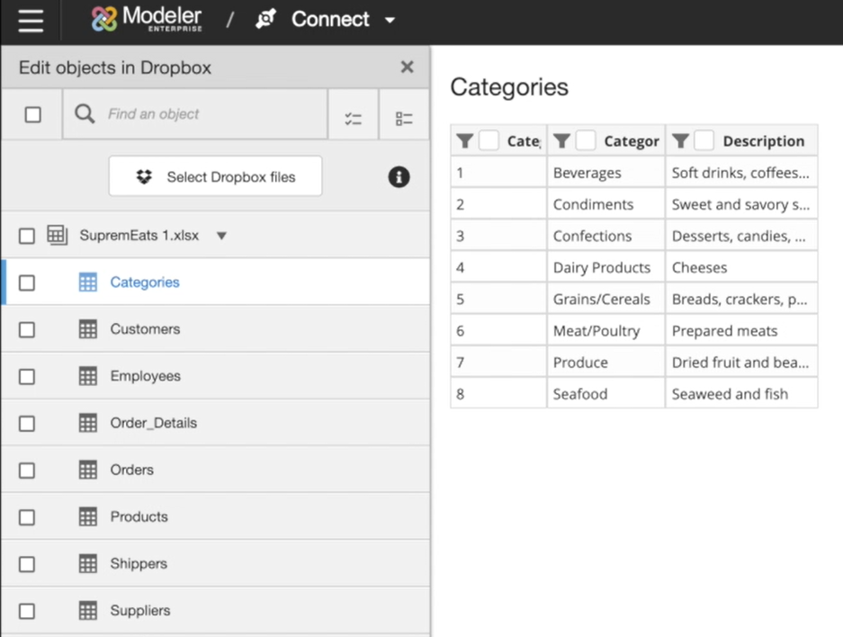 Configuring Dropbox Data Sources Select the Dropbox connector from the Connector section or click the existing Dropbox connection from the Connections panel. Click Edit. Click Select Dropbox files. Select the Dropbox files, and then click Download. After downloading the files, select the items in the file to import. Then, click Done. After creating your objects, click the Import {Connector Name} Data button to extract your information to Birst. Note: You can safely log out of Birst while the extraction takes place and log back in later.