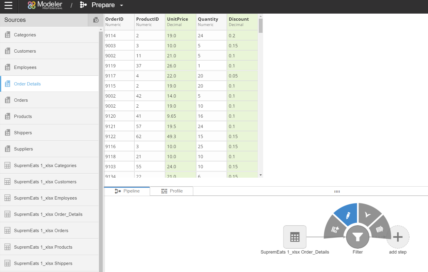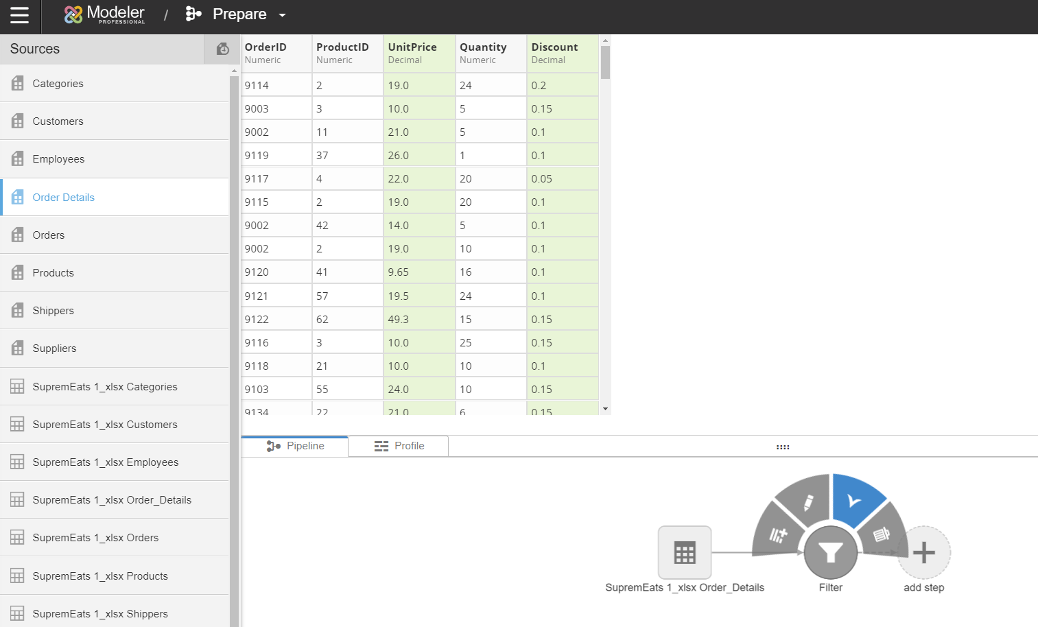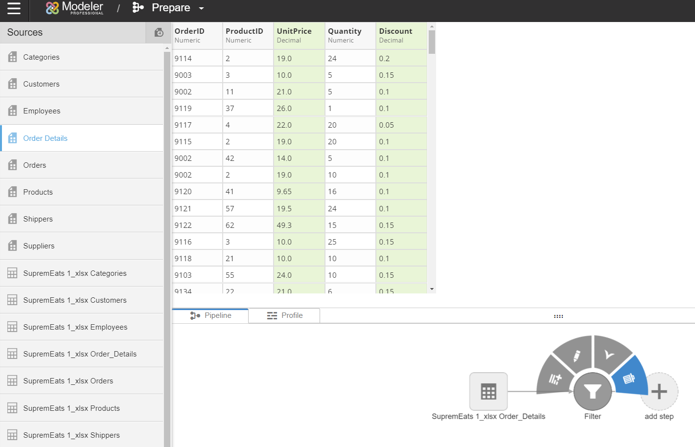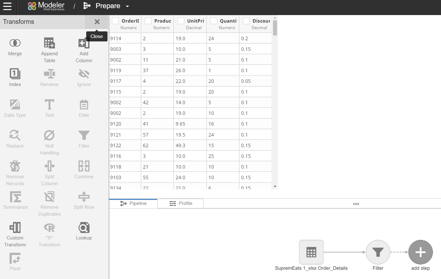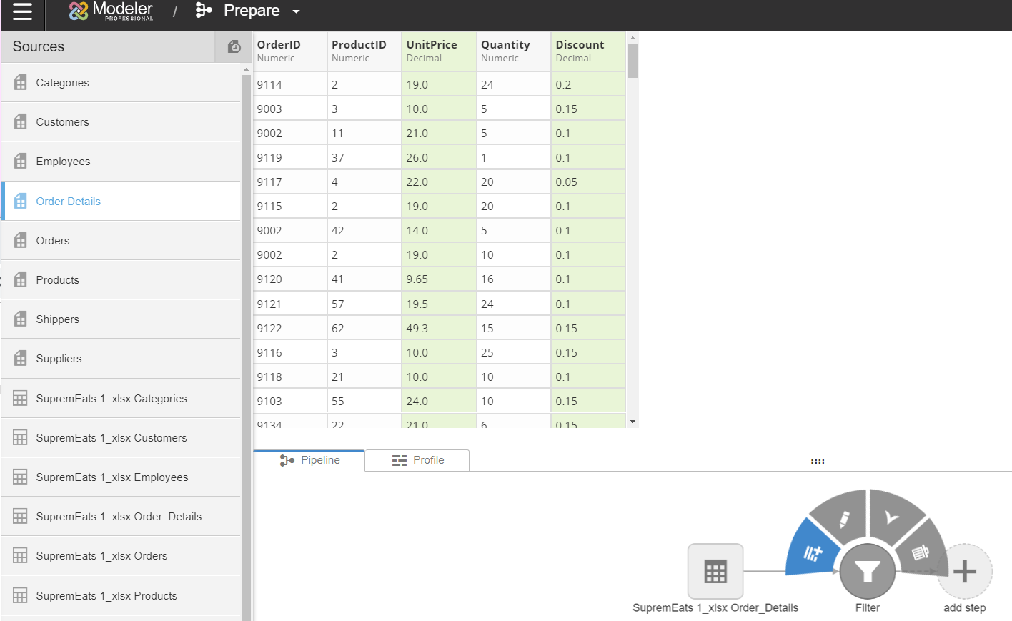 Modeler Prepare has the options for transforming the raw data into report-friendly formats. The pipeline at the bottom of the page shows the history of these transformations. The pipeline itself has useful tools for managing the transforms.