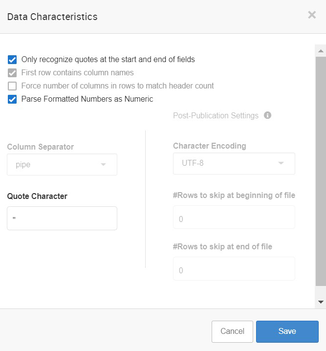 Note: Some data characteristics are automatically set based on the file type. - From the Data Characteristics menu, select the characteristics to use: