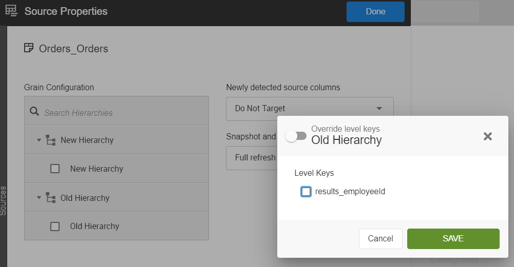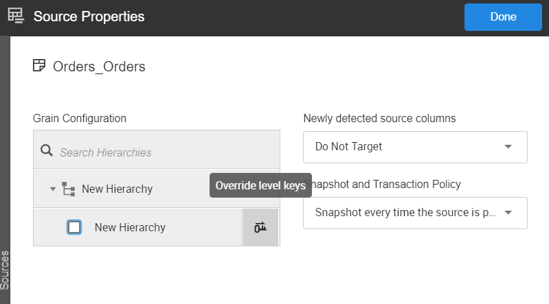 For example, if a given level has a composite level key defined as column1+column2, the user-ready data store will be loaded with the composite level key configuration. But after the data store is loaded, while joining the dimension level with that fact, if you only want to use column1, you would define the override level key as just column1.