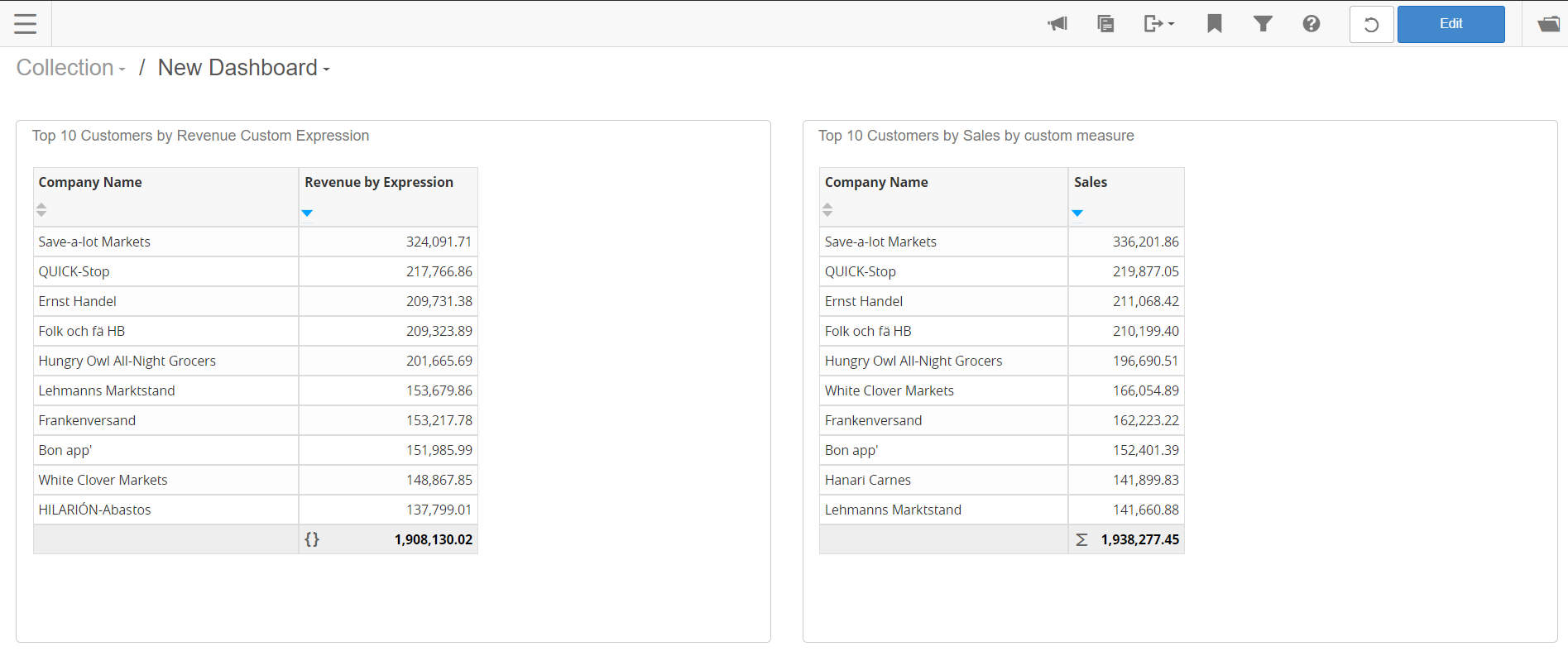 For example a report uses the custom set, based on the revenue defined by the custom expression, but now the results are identical to the report built using the custom measure, Sales (pre-aggregation). Lehman's is ranked 10th and Hanari Carnes returns to the result set. The measure values were also calculated identically this time because the expression was applied to every row of data in the database just like the sales custom measure.