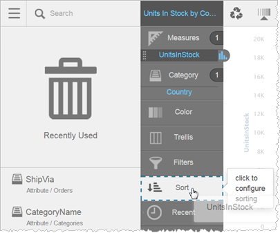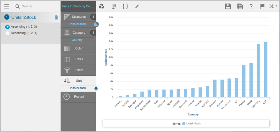 Sort data in a report using Sort in the Chart Builder. Measures can sort in ascending or descending order. Attributes sort alphabetically or reverse-alphabetically. If you sort by a time or date attribute such as by Day or Month, the report is automatically sorted based on the sequential order of the date value and not based on the alphabetical sort.