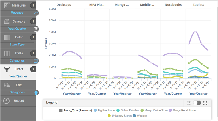 You can create trellis charts in Visualizer using Trellis in the Chart Builder. Use trellis charts to identify patterns and trends across a series of charts.
