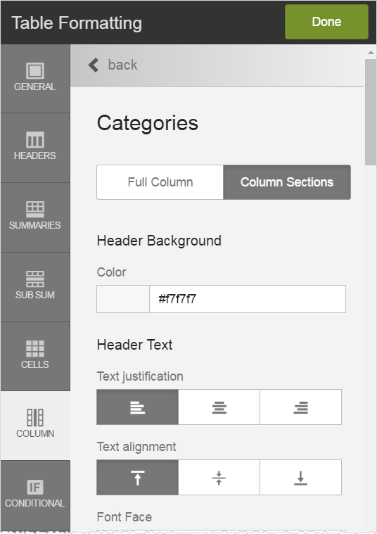 Click Done at the top left, and then click Save when you are finished formatting. Optionally, to specify the number of decimal places or add a currency symbol for a measure, click the measure in Columns and select the Data Formatting option. See Formatting data in a Visualizer table.