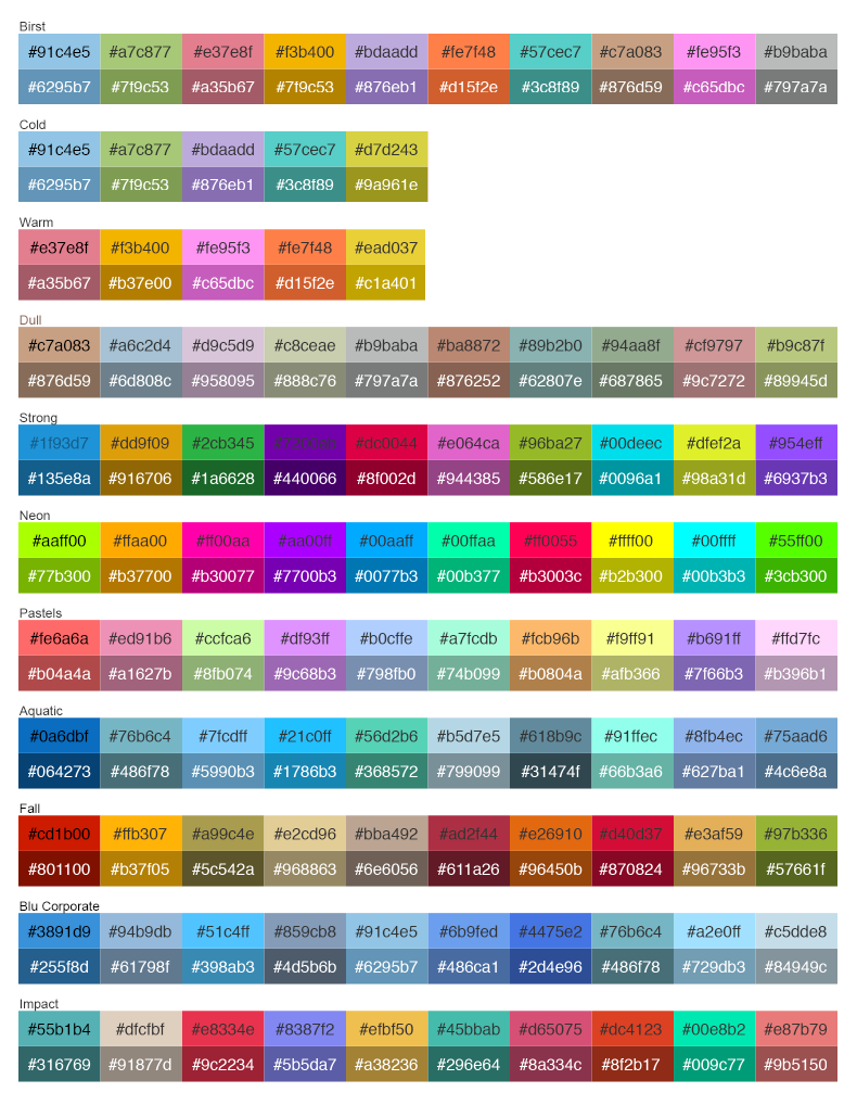 Here are the HEX codes for the Visualizer color palettes. Use them to unify your color schemes across reports and dashboards.