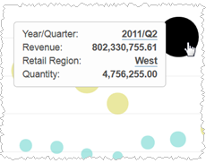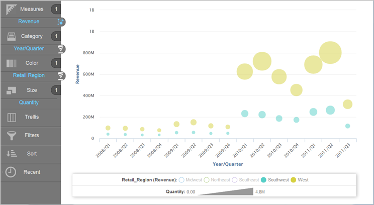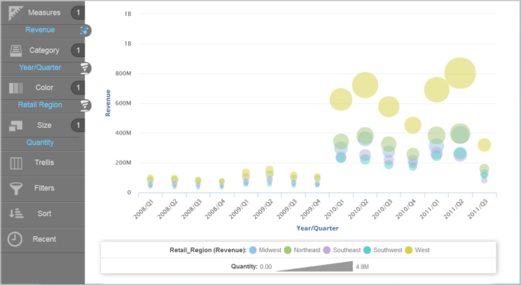 Visualizer creates a bubble chart using the Quantity measure as the size of the bubbles.