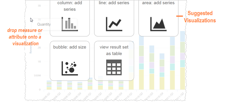 You can drag and drop measures or attributes into a visualization and view suggested visualizations to add.