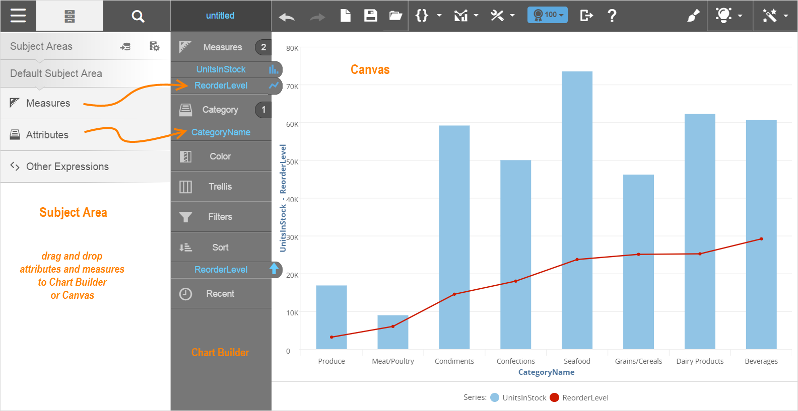 The Visualizer Toolbar has features that allow you to create a new report, open existing files, perform metric analysis, and configure charts.