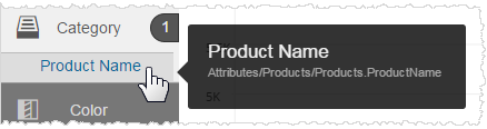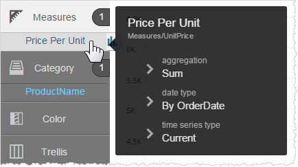 In Chart Builder when you hover over an attribute, measure, or report expression a popup tooltip shows more details about them. For measures, you see the label (alias) name, original name, aggregation, date type, and time series type.