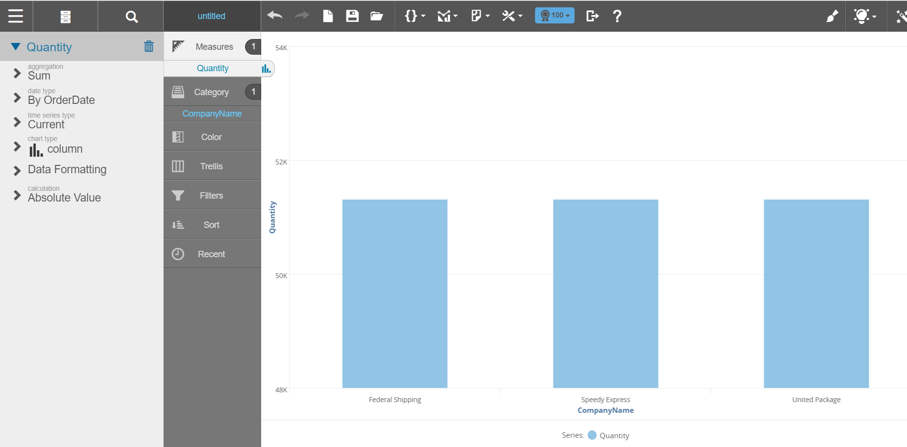 SELECT TOP 100 USING OUTER JOIN [OrderDate: Sum: Quantity] 'COL0' , [Shippers.CompanyName] 'COL1' FROM [ALL]
