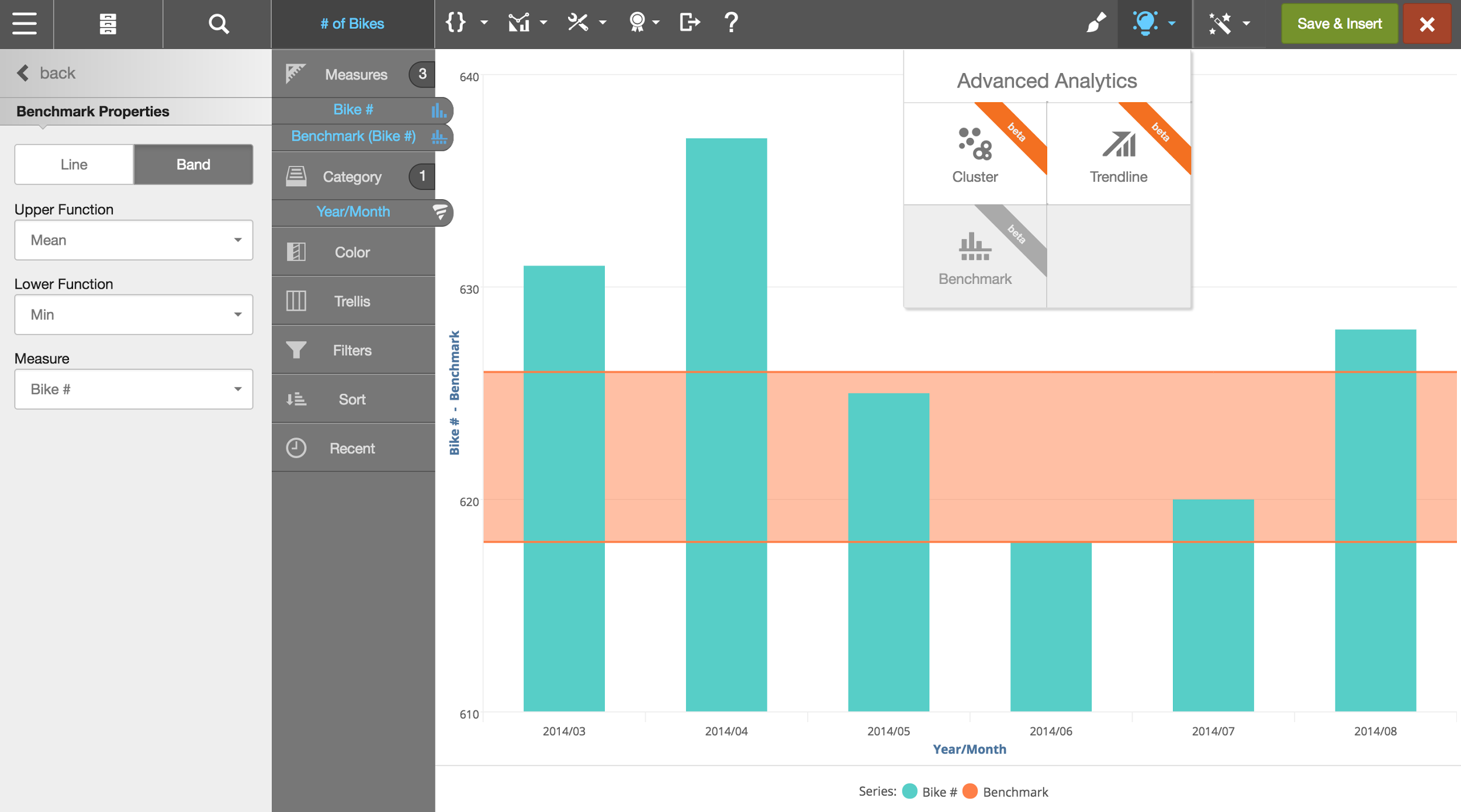 The Benchmark functions have been added to 1-Click Advanced Analytics (in Beta). Benchmark provides a reference across the attributes of a measure via a line or band display. A Benchmark can be the Mean, Min, Max, Median, or a Constant of the measure value. A band is a range between two benchmark lines.