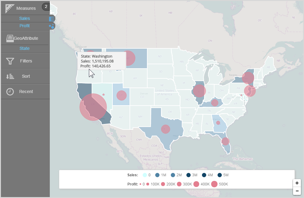 - Add a second measure to an existing map; for example: Profit.