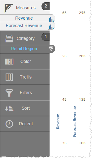 If you have a chart with multiple measures that use the same basic data types and ranges, you can merge the axis so that multiple measures use the same axis. By default Visualizer may automatically merge some axis.
