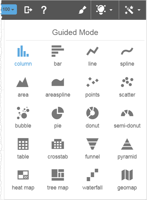 If you have in mind the type of chart you'd like to create, you can start creating your report by selecting a chart type. Visualizer provides guidance on how to create the chart.