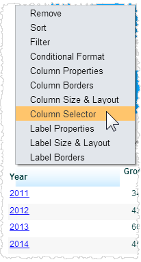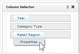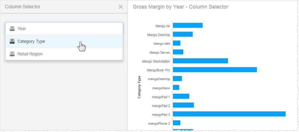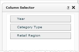 Column selectors in Classic Designer reports allow business users to modify a default report by selecting a different combination of attributes and measures. You can design a report so that dashboard users can make selections from a list that changes the information in the report, for example, to view sales by year, by category type, or by region. This enables the dashboard user to perform simple ad-hoc analysis.