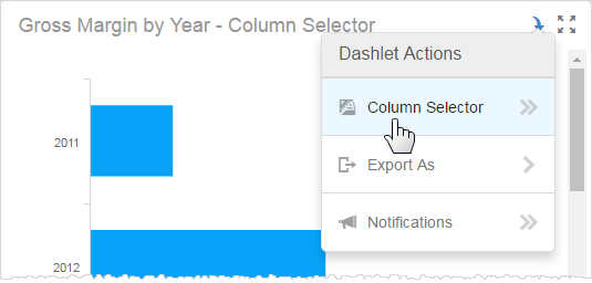 In Dashboards 2.0, column selectors are available to users from the Dashlet Actions menu as either Attribute Selectors or Measure Selectors. You do not have to set any special configurations in Dashboards 2.0 in order for the column selectors to operate.