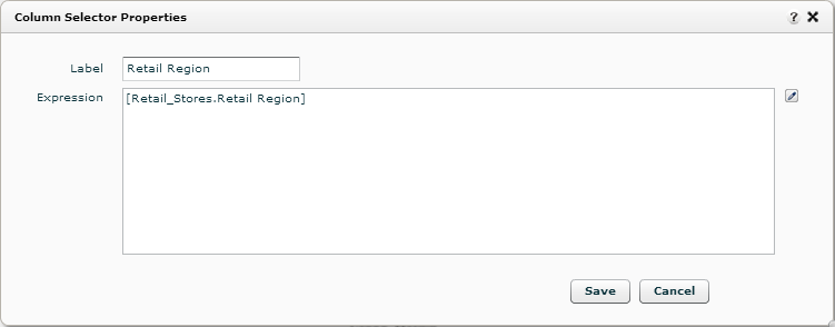 Tip: You cannot change the properties for the first column in the Column Selector dialog box (the column you first selected in the table). To change the column label for this column, click the column header in the report table and select Label Properties. To change the expression, click the column header in the report table and select Column Properties.- To change