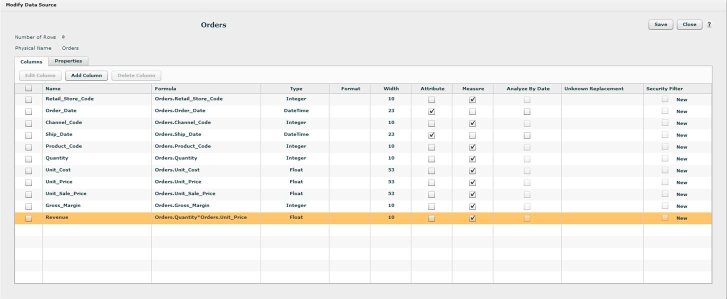 You may need to add a custom column to a Live Access table. For example, if a measure for Revenue does not exist directly in a Live Access table that you have imported into Birst, you can add a new column to the table and specify a formula such as: Quantity*UnitPrice.