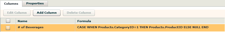 field, enter the formula you want to use as in the example below:![]() In another example, you could create a column called "# of Beverages" and use a CASE statement in the column expression to count only Beverages products as shown below: ![]() Tip: The formula needs to be syntactically correct for the database the source is pointing to. For example, if it is Oracle, then you need to use Oracle specific syntax. |