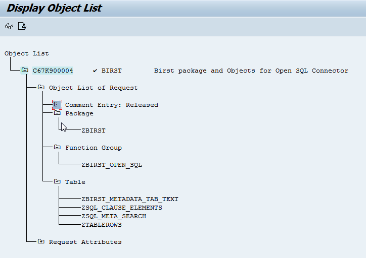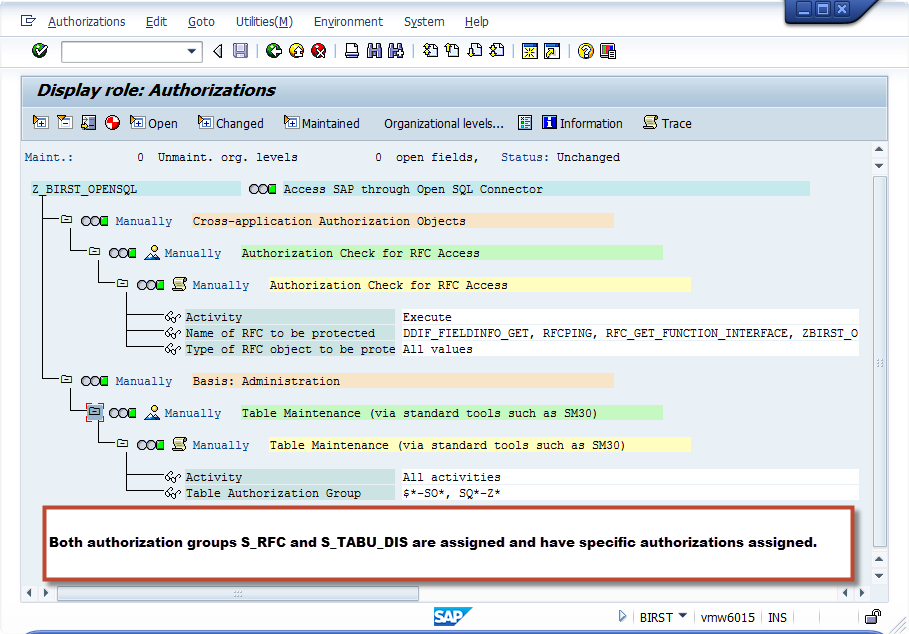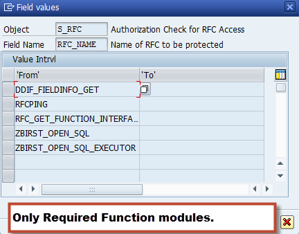 This is the list of functions required to run the Birst Open SQL Connector. Here you specify only these function modules to restrict access to any others.