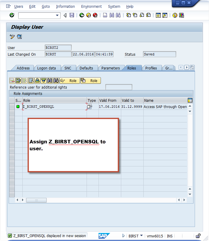 - On the Roles tab, enter the Role ZBIRST_OPENSQL.