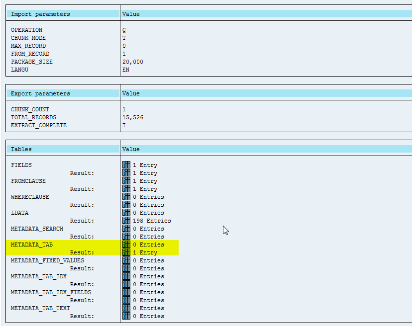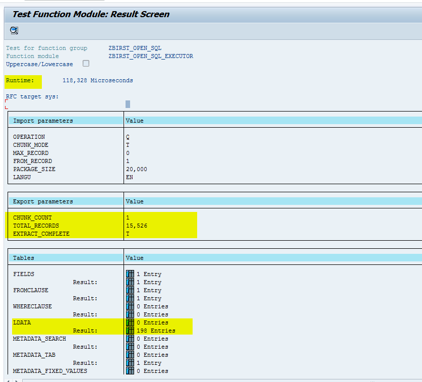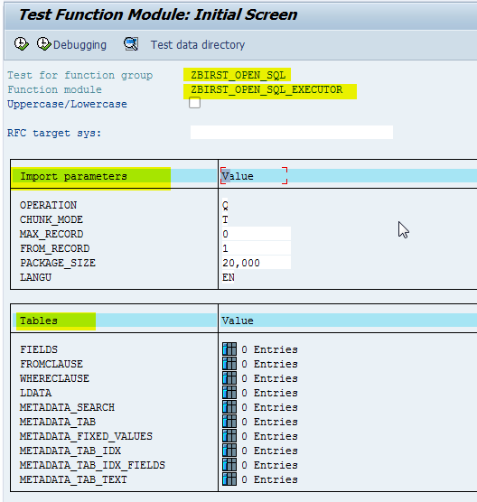- From the Function Builder initial screen SE37, choose Test (F8). The Test Function Module screen appears and displays all of the import and table parameters of the function module.