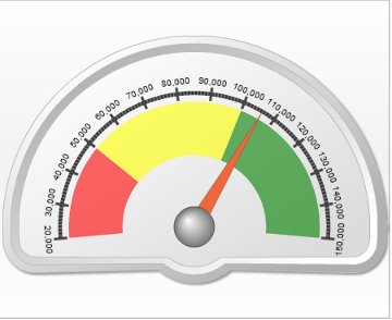 A chart that displays a single value in the form of a needle on a dial. It is most useful on an executive dashboard to track a key performance metric against defined thresholds. It requires at least one category and one series.