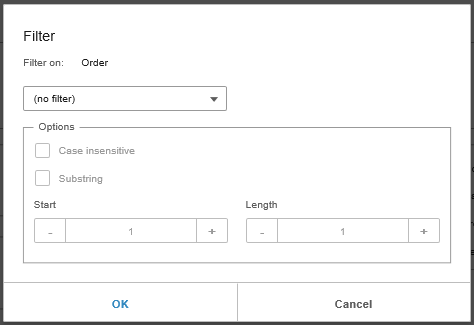 | Case Insensitive | Specifies whether case should be ignored. Clearing the check box means that case is considered when returning results. This option is only valid for alphanumeric fields. |