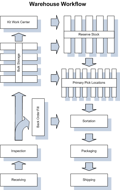 This workflow provides an example of how you can reduce movement as inventory is received at the dock and processed. Product can be inspected for quantity and quality, and backorders can be filled in the cross-dock area. The remaining stock is placed in a bulk storage area to replenish stock to the kitting department, overflow stock, and primary pick zone or area. As goods are picked, the goods are moved to the sortation area, then to the packaging and shipping departments and out the door. This diagram shows an example of a warehouse layout that reduces movement when inventory is received: