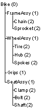 Para comprender el proceso de planificación que MRP utiliza para satisfacer los requisitos de un artículo tenga en cuenta una sencilla BOM para facturar una bicicleta. En este ejemplo tenemos una Bicicleta como artículo final que está hecha de un subensamblaje Cuadro, un subensamblaje Rueda (por 2), Empuñaduras (por 2) y un subensamblaje Sillín. En la siguiente representación gráfica, el número en paréntesis representa el código de nivel bajo para cada nivel en la BOM.