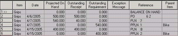 - Pase cualquier recepción de programa de producción a la BOM del programa de producción (si existe. Si no, pásela a la BOM actual), creando requisitos de programa de producción principales (registros PPP) para los componentes adecuados. En este ejemplo, había un programa de producción para el artículo Empuñaduras, pero el artículo Empuñaduras no tiene componentes.