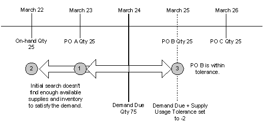 Cuando el sistema planifica una demanda, empieza buscando hacia atrás los suministros que están planificados para que estén disponibles entre la hora/fecha de vencimiento de la demanda y la hora/fecha actual Si los suministros disponibles durante ese tiempo no satisfacen la cantidad de la demanda, el sistema busca stock disponible. Si aun así no se satisface la demanda, el sistema puede usar Tolerancia de uso del suministro para buscar aquellos suministros con una planificación de disponible TRAS la fecha de vencimiento de la demanda.