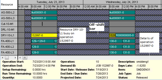 Haga clic en una barra de utilización de recurso para ver detalles sobre la operación que está realizando el recurso y la demanda en la que está trabajando durante el período de tiempo. Haga clic en una barra de tiempo de inactividad para ver detalles acerca del motivo y la duración del tiempo de inactividad.