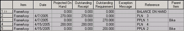 - Traite les besoins pour l'article, comme décrit plus haut dans la section Traitement du code de plus bas niveau 0. Crée des ordres planifiés pour satisfaire chaque besoin en souffrance :