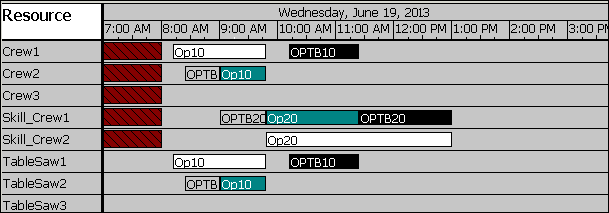 Notez que les ressources Personnel1, Personnel_qualifié1 et ScieCirculaire1 effectuent le travail qui, dans le mode APS, était réparti sur plusieurs ressources. En mode APS à capacité infinie, les ressources ont des capacités infinies et un seul type de ressource nécessaire est chargé.